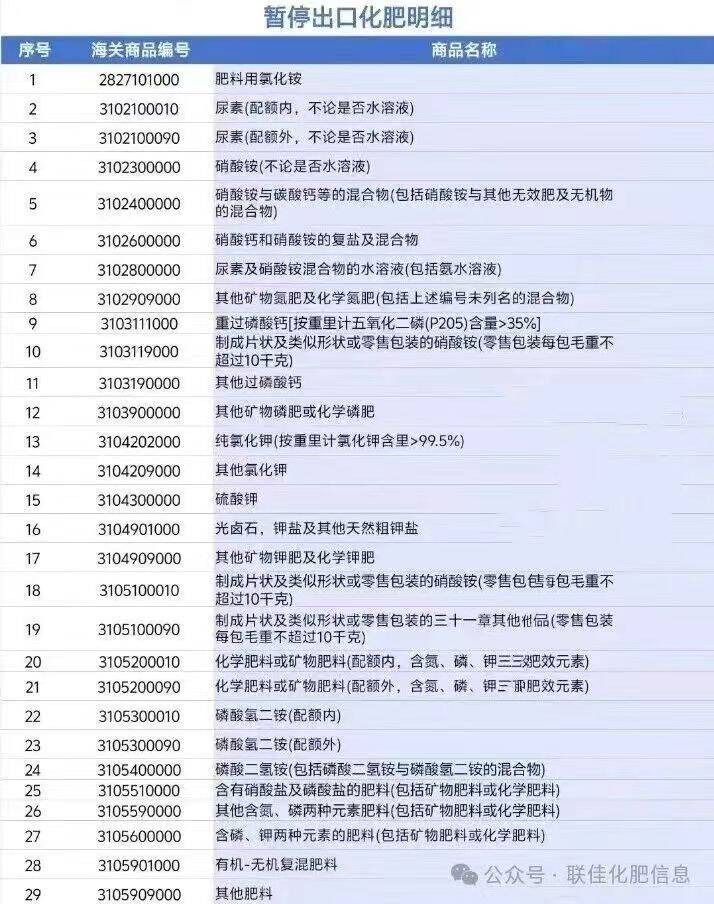 2026年3月25日,海关已暂停以下明细所有肥料产品出口通关,包括磷肥、尿素、钾肥、复合肥等,单证出口新报检申请不再受理,已申报未放行的货物也一律不予放行